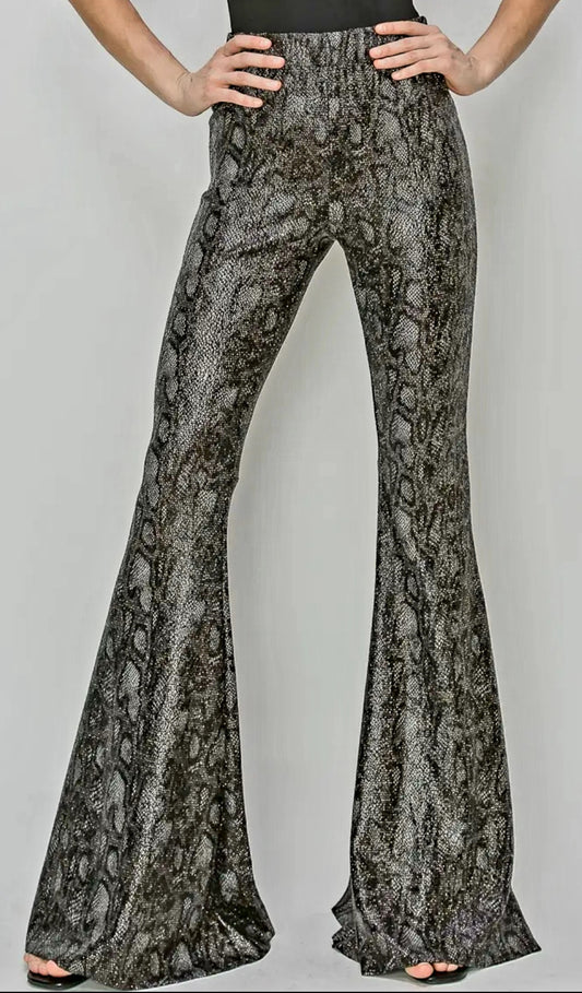 Pants - Gorgeous Python Black & Gray Python Bell Bottom Knit Pants w/ Shiny Gold Metallic Flecks- Sizes Small to Large