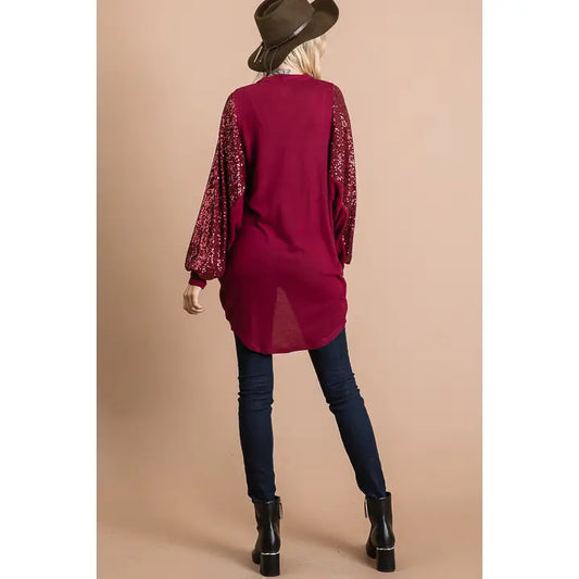 SALE - Burgundy V-Neck Balloon Sleeves Sequin Blouse