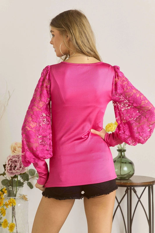 Sale Clearance - Fuchsia Silky Knit Top with Sheer Lace Puff Long Sleeve