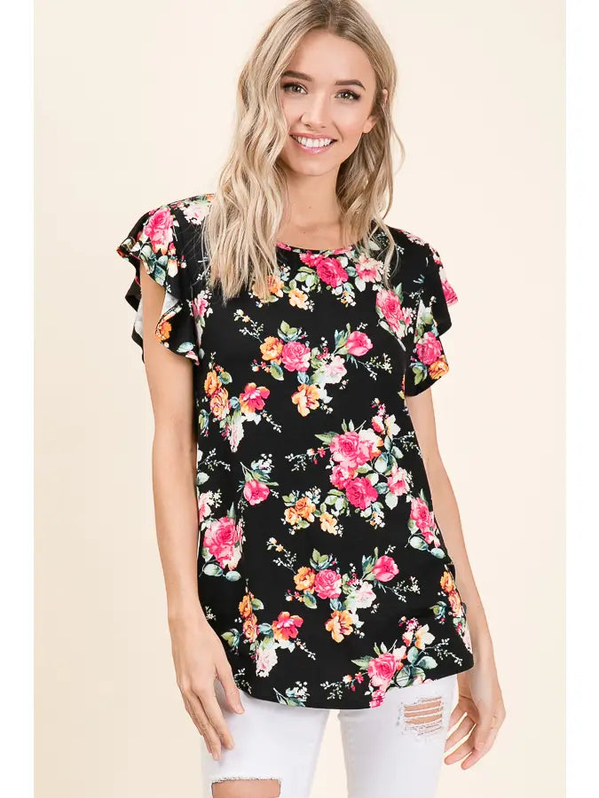 Top NEW ARRIVAL - Floral Ruffle Sleeve Top on Black Background