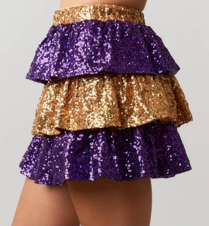 Get ready for game day with our eye-catching Mardi Gras sequin mini skirt in team shades of bold gold and vibrant purple! This skirt is sure to catch everyone's attention and show off your team spirit. Perfect for showing your passion and style at any sporting event.