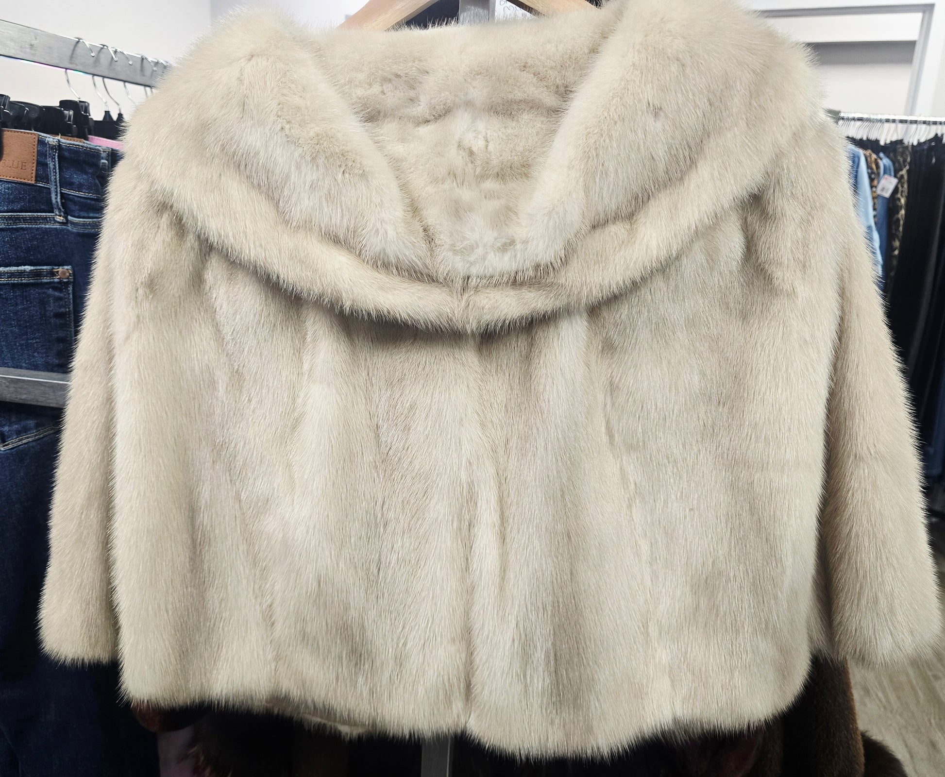 Wrap yourself in understated luxury with this authentic fur stole, featuring a captivating ivory and taupe colorway that transitions seamlessly from day to evening wear.