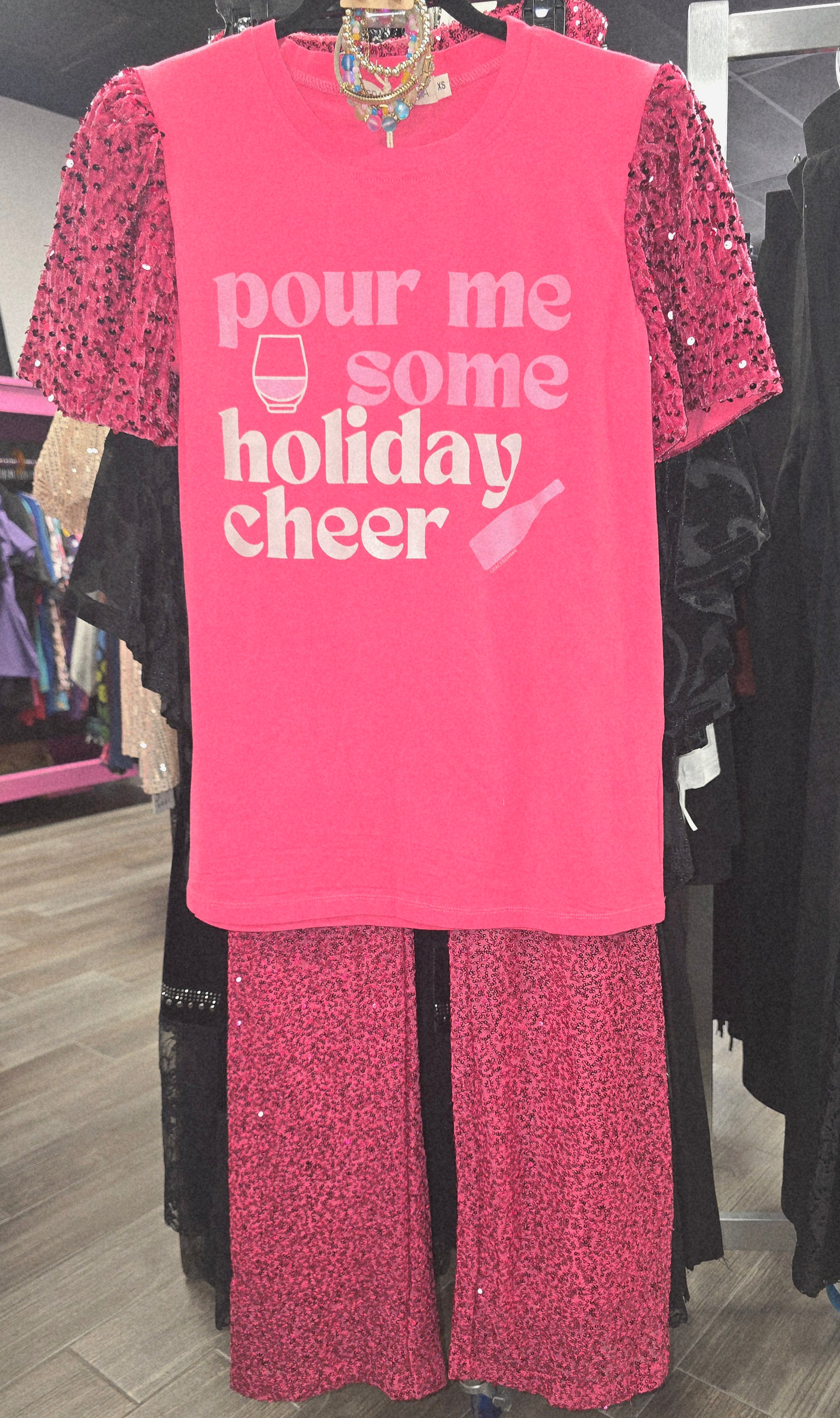 Christmas Holiday "Pour Me Some Holiday Cheer" Graphic Fuchsia Cotton Top with Matching Velvet/Sequins Puff Sleeve - Sizes Ex Small - 2X | New Arrival | Charlotte's Classy Closet
