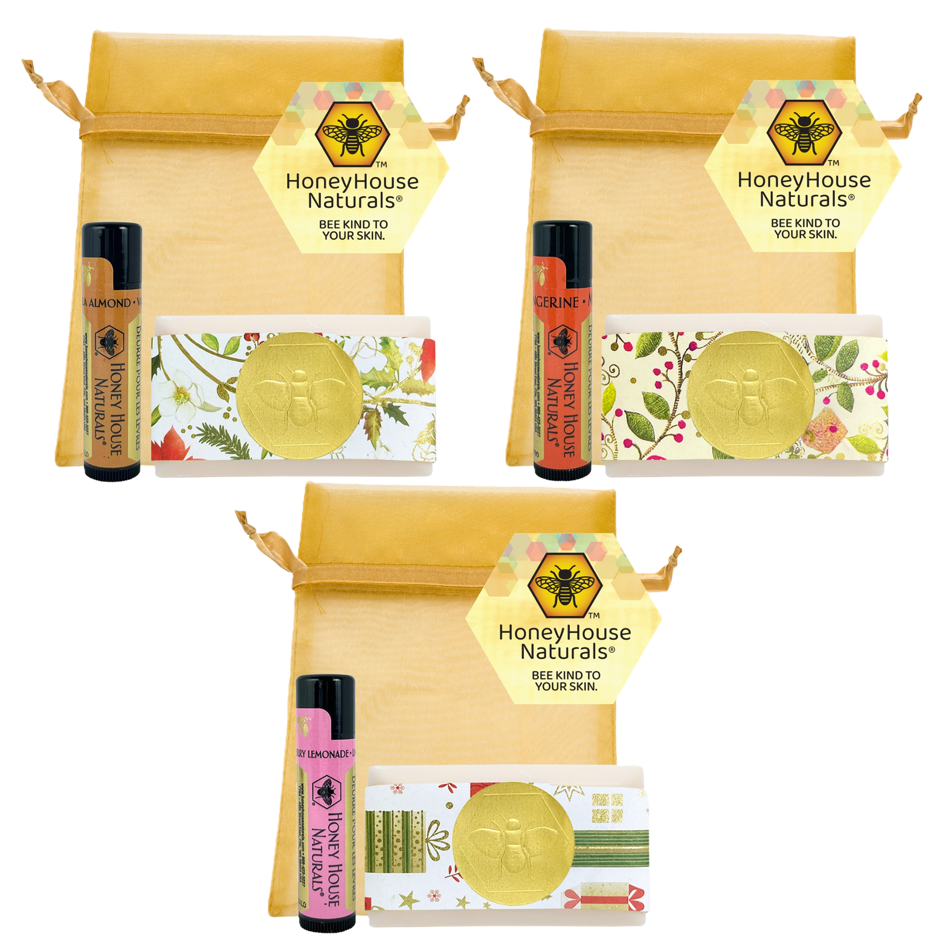 This 2 piece gift set features a gorgeous Florentine wrapped paper wrapped 1oz Honey Blossom soap and a popular Lip Butter Tube. Perfect as a quick pick up Christmas gift, stocking stuffer, teacher gift, or for travel. The soap contains natural ingredients like Shea Butter and Royal Jelly, while the Lip Butter Tube is filled with Beeswax and anti-aging Pomegranate Seed oil. Our customers love our Honey House Naturals products!
