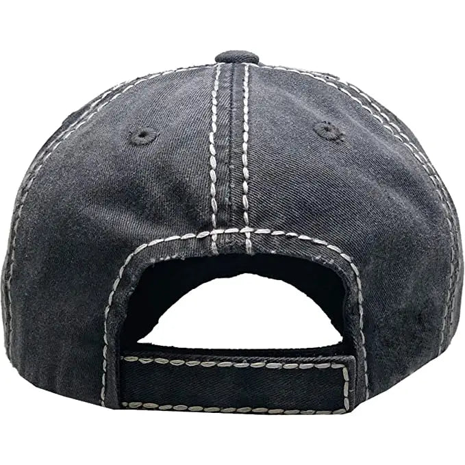 Fuel your day with the Black Distressed Baseball Cap - the perfect accessory for those who run on caffeine and kisses.