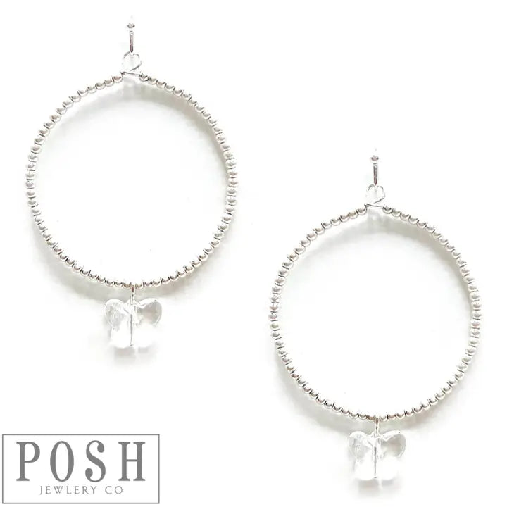 Beaded Circle Shaped Silver Tone Earrings With A Clear Crystal Butterfly Drop Charm