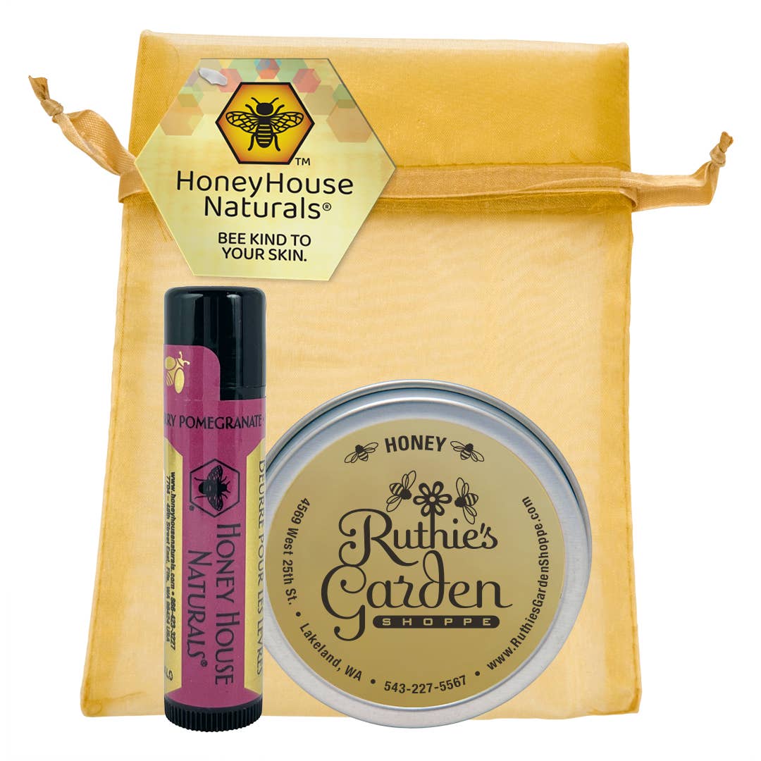 Honey House Naturals 2-Piece Gift Set - Honey Scented Lotion and Raspberry Pomegranate Lip Butter wrapped in a Gorgeous Gold Organza Bag