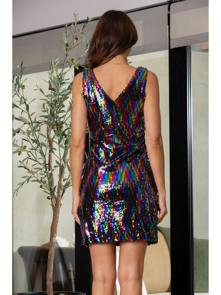 Be the life of the party in our MULTICOLOR SEQUIN V-NECK SLEEVELESS MINI DRESS with its dazzling multicolor sequins and flattering v-neckline, this dress will make you shine and stand out in the crowd.